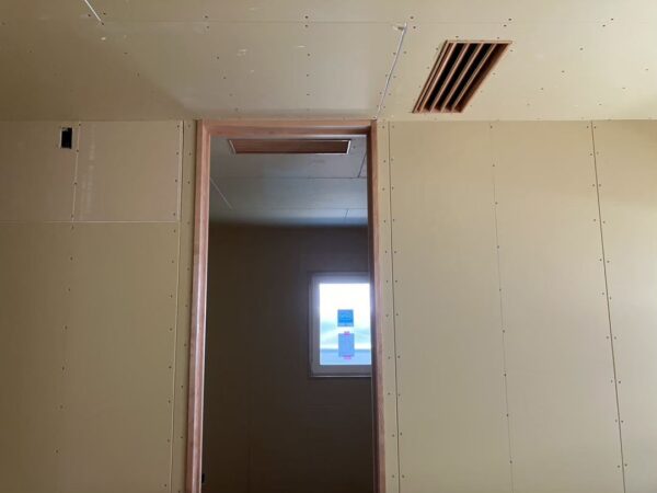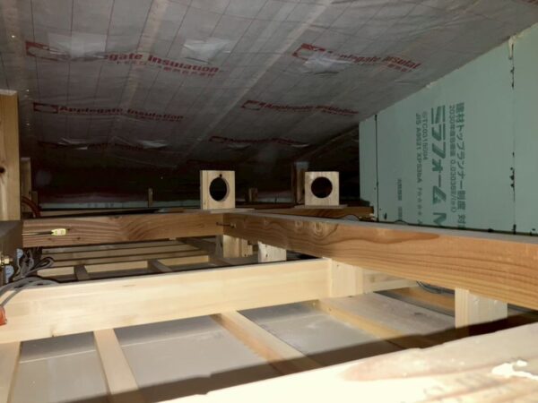 小屋裏の様子。2つある小型のスピーカーのようなものは、エアコンの冷気を小屋裏全体に行き渡らせるためのファンの台座です。エアコンからの距離によって、冷え方に差が出ないように取り付けています。