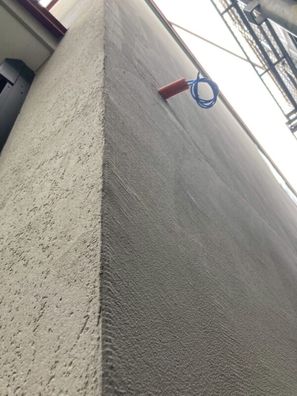 先月、付加断熱(外断熱)工事の様子を書きましたが、工事は順調に進み、外壁仕上げ材のガルデの施工が進んでいます。写真右側は二度塗りを終えた状態。左側はその上から仕上げの塗りを施した状態です。仕上げの際に骨材を混ぜて塗るので、ザラザラした細かな陰影のある風合いに仕上がります。