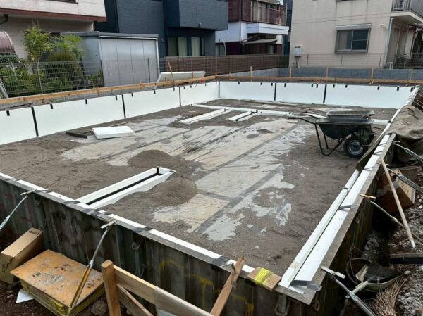 基礎ができあがりました。矢印の白い部分が断熱材のパフォームガードです。建物の基礎が断熱材で覆われているのがよくわかると思います。このあと、専用の板金とモルタル塗装で、断熱材の表面をしっかり保護していきます。