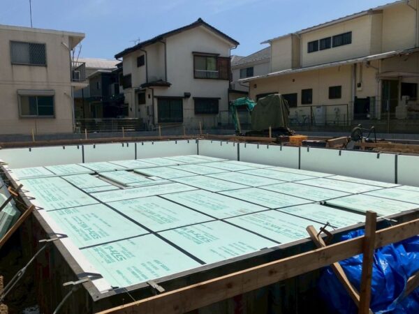 まずは基礎全体を囲うように、断熱材で壁を作ります。この断熱材は「パフォームガード」といって、あらかじめシロアリ対策用の防蟻剤を混ぜ込んで成型された、基礎用の断熱材です。