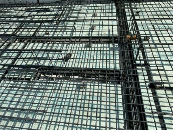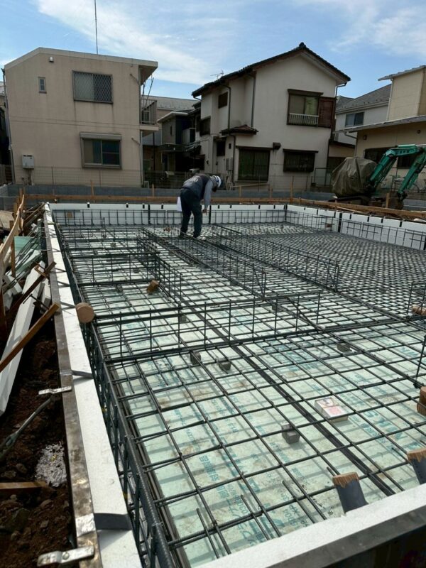 配筋を組んでいきます。ところどころ配筋が密になっている部分は地中梁です(基礎梁ともいいます)。地中梁の位置や強度は、許容応力度計算(構造計算)によって算出しています。許容応力度計算を行うことによって、地震や台風に強い頑丈な家ができあがります。