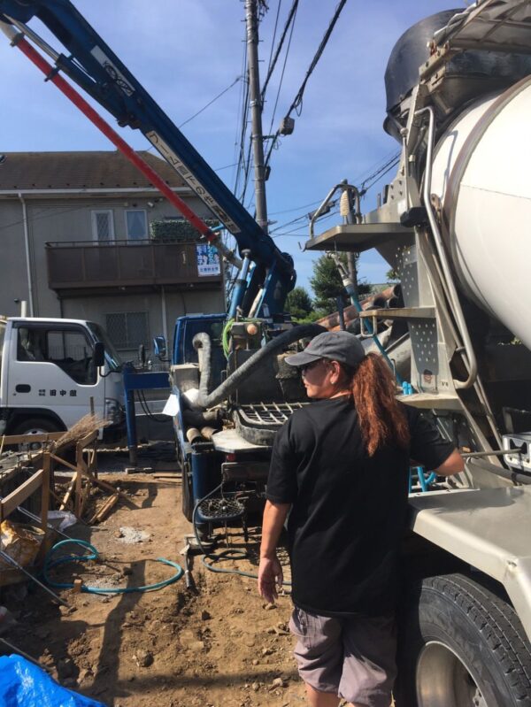 コンクリートの打設が始まりました。最近は女性の現場監督や職人さんを見かけることも増えてきました(写真の女性は、生コンを運ぶミキサー車の運転手さんです)。