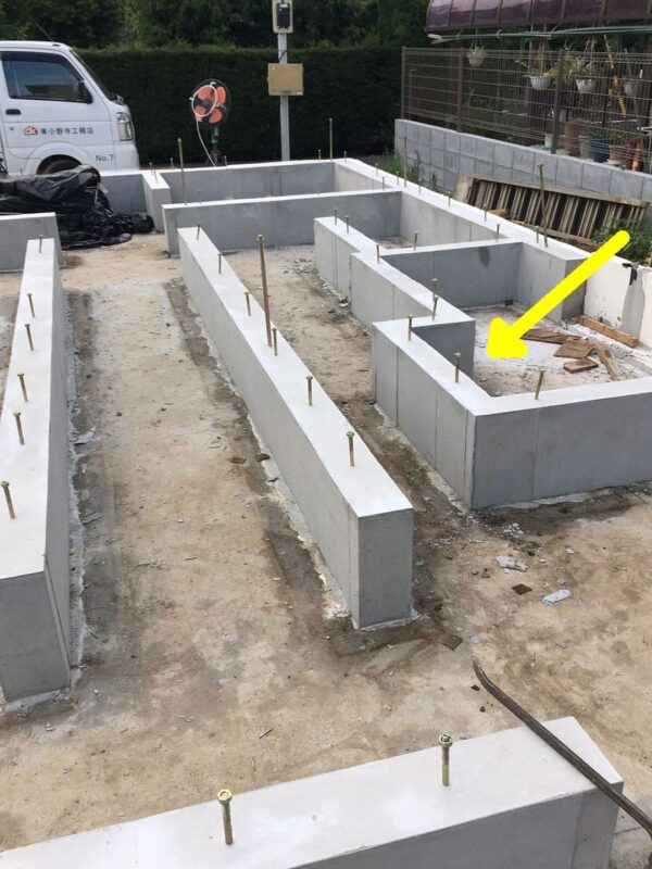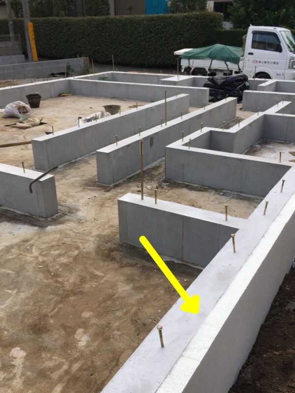 少し基礎断熱の話から逸れますが、できあがった基礎の矢印の部分が少し複雑な形状になっています。さて、なぜでしょうか?