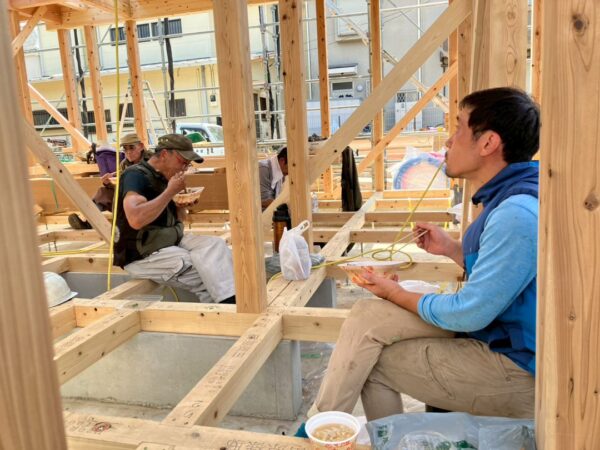 お昼ごはんの様子です。なんだかみんな疲れているように見えませんか?今回はお盆の時期ということもあり、少数精鋭のスタッフによる上棟となったのですが、想定をはるかに超える暑さにやられて、午前中だけでみんなへとへとになってしまったのです。