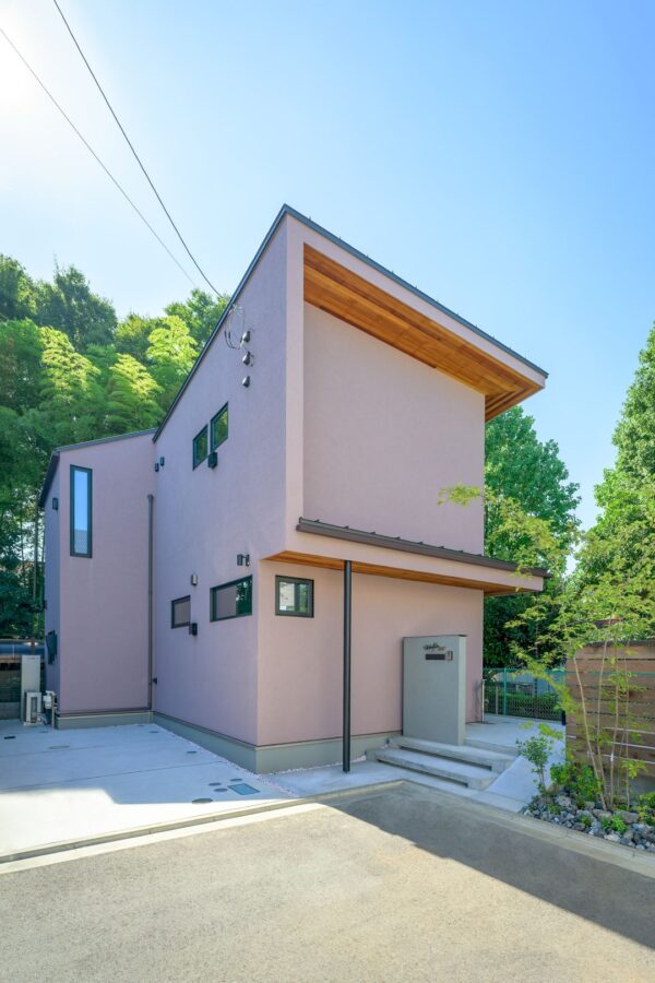 まずは外観から。あずき色の塗り壁と、逆コの字型の意匠デザインがI様邸の特徴です。この写真は真北から撮影したもので、I様邸の敷地の南東側には竹林、南西側には緑豊かな公園が隣接しています。竹林と公園の緑をいかに取り入れるかが、I様邸のプランニングの大きなポイントになりました。