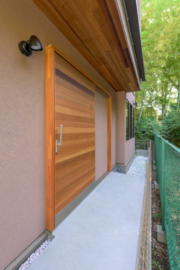 無垢材を横張りにしたステキな玄関ドアは、株式会社コシヤマさんの「MOKUGEI -木鯨-」。高気密・高断熱仕様の国産木製玄関引き戸です。