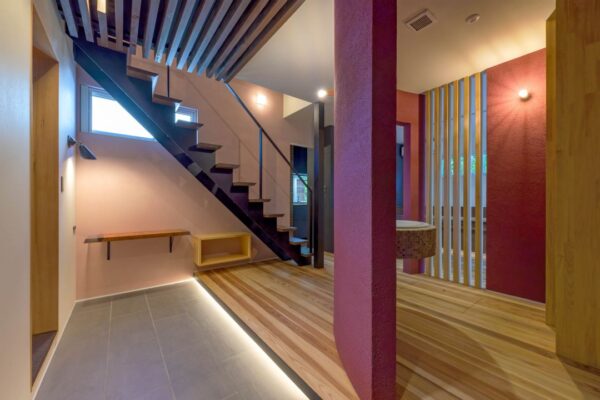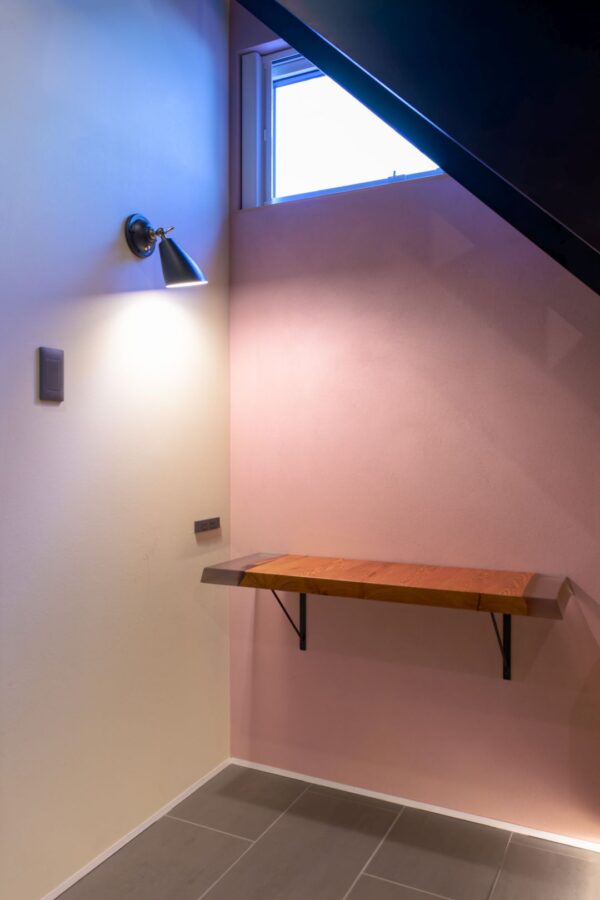 玄関を入ると、目の覚めるような濃いピンク色の壁が正面に現れます。ここはハーフオープンスタイルの洗面室で、ピンクの壁はジョリパッド塗りで仕上げています。