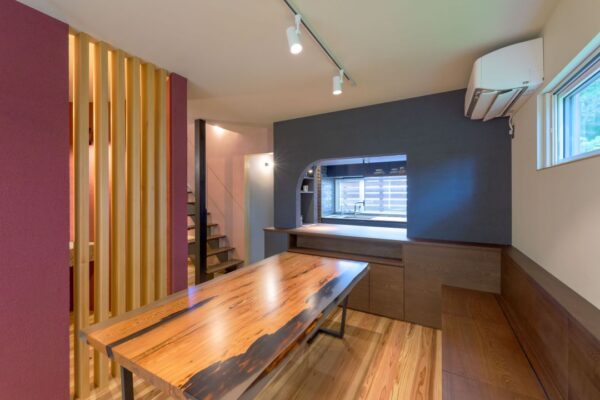 I様邸のダイニングとキッチン。椅子代わりのベンチは、キッチンのカウンター台とあわせて、家具屋さんにオーダーして作ってもらっています。キッチンとダイニングを仕切る濃いグレーの壁も、ピンクの壁と同じジョリパッド仕上げです。