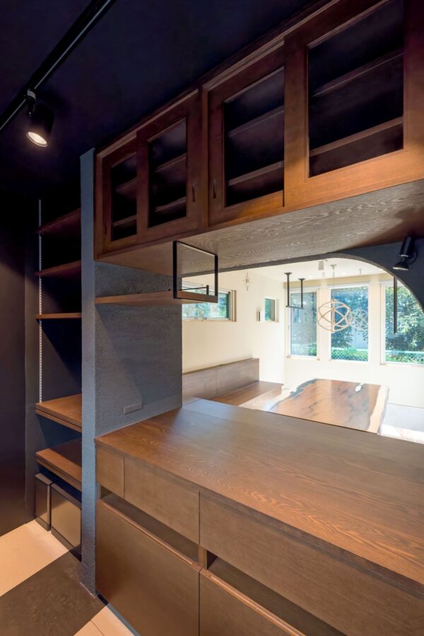 ダークブラウンのキッチンカウンターと収納棚は、家具屋さんに製作を依頼したオーダー品です。バルクッチーネの重厚な佇まいに負けないよう、国産の上質の木材を使って、しっかり丁寧に作っていただきました。