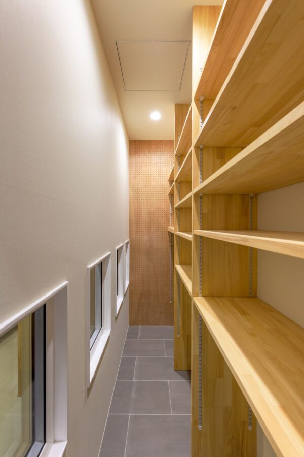 場所を移動して、玄関土間の横にあるストレージルームです。正面の壁は、有孔ボードを仕上げ材に使っています。左側の4つ並んだ窓からは、隣のオウムさんたちの部屋を覗くことができます。なんだか、動物園のバックヤードみたいでワクワクしますね。