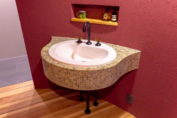 この洗面台は、タイル職人さんによる渾身の作品です。1センチ角のタイルを曲線に合わせてひとつひとつカットし、丁寧に貼り込んでいます。なんというか、住宅設備という枠を超えて、ちょっとした工芸品のような存在感です。