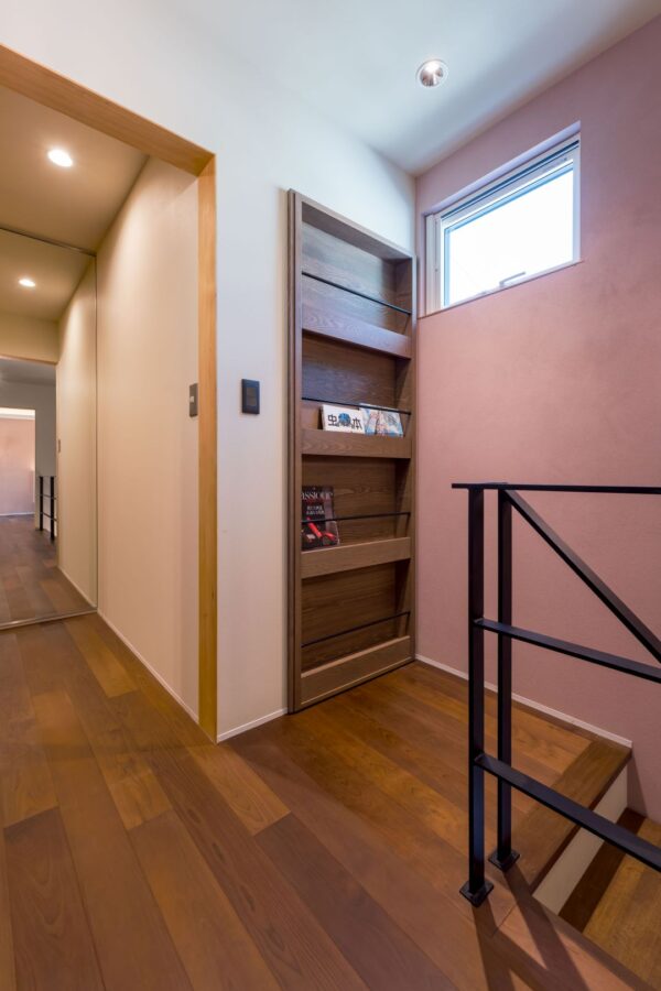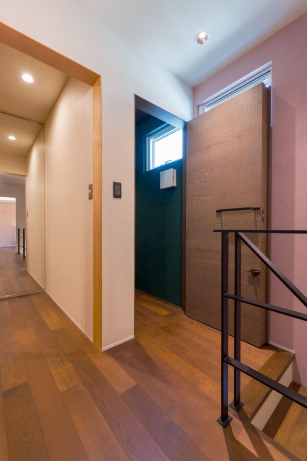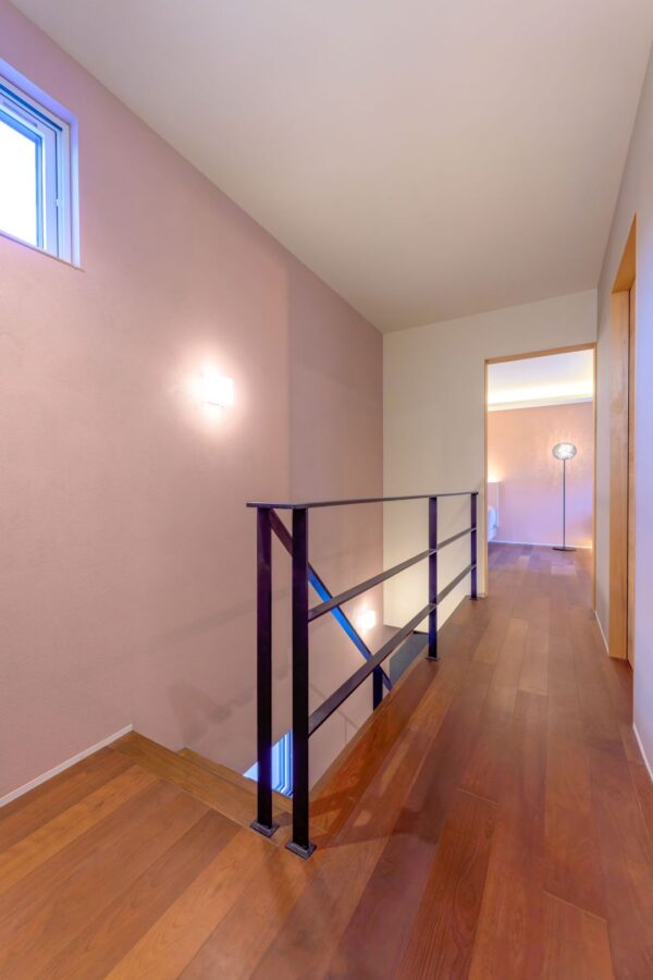 2階廊下です。スモーキーピンクの壁は、ここもジョリパッド塗りで仕上げています。正面に見えるのは主寝室です。