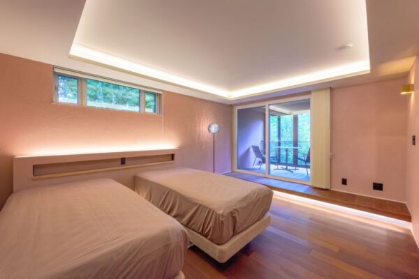 折り下げ天井を採用した主寝室。廊下と同じスモーキーピンクが色鮮やか。インナーバルコニーの向こう側に、隣接する公園の樹木が見えていて、なんだかどこかの高原ホテルの一室のような雰囲気ですね。