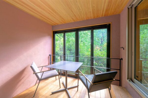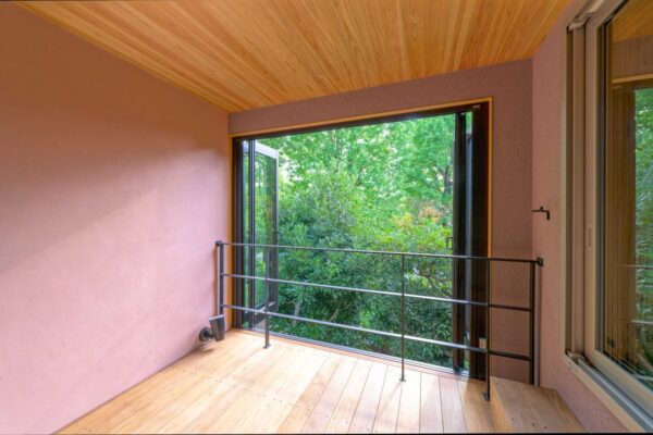 緑いっぱいのインナーバルコニー。紅葉や新緑の季節が楽しみです。こちらの壁もスモーキーピンクのジョリパッド仕上げにしています。壁の色をそろえているので、内と外が自然につながった空間に感じられます。