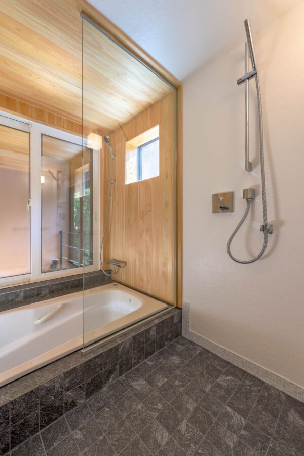 こちらが浴室。インナーバルコニーに面していて、まるで露天風呂のような雰囲気。ユニットバスではなく、造作の在来浴室です。2階に在来浴室を設置するにあたり、水漏れ対策として屋上プールなどに使われるFRP製の大型パンを浴室全体の受け皿として採用しています。