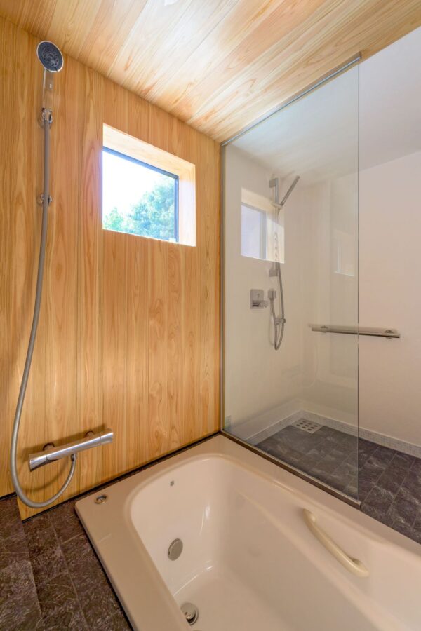 浴室の写真をもう一枚。壁には無垢のサワラ材を貼っています。サワラはヒノキの仲間で、ヒノキより水に強く、昔は風呂桶や飯びつによく使われていました。