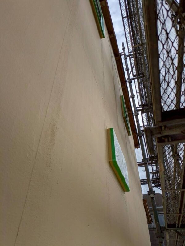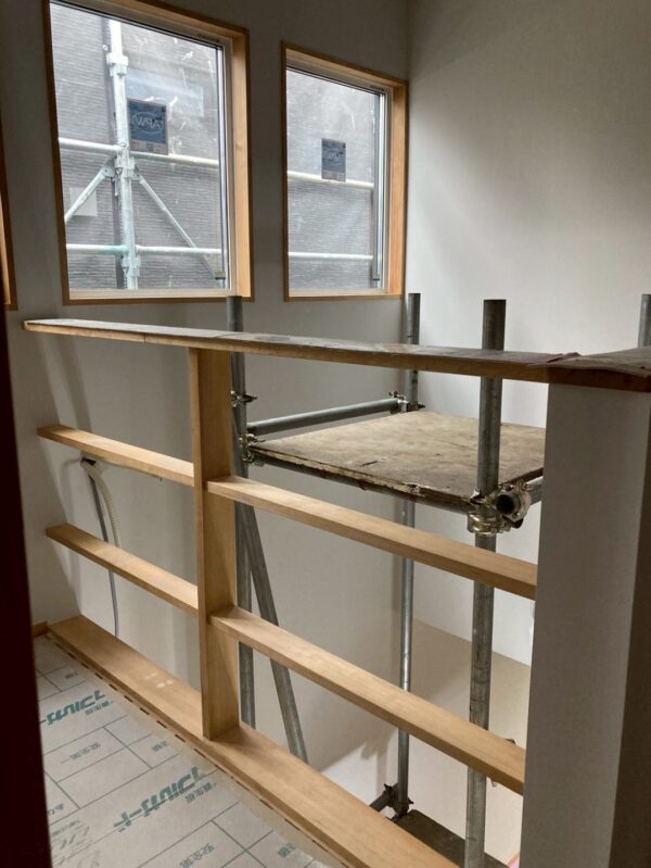 こちらは吹き抜け部分。壁紙を貼るために組んだ内部足場も、もうすぐ解体予定です。完成が近づくにつれて、現場がどんどんスッキリしていきます。