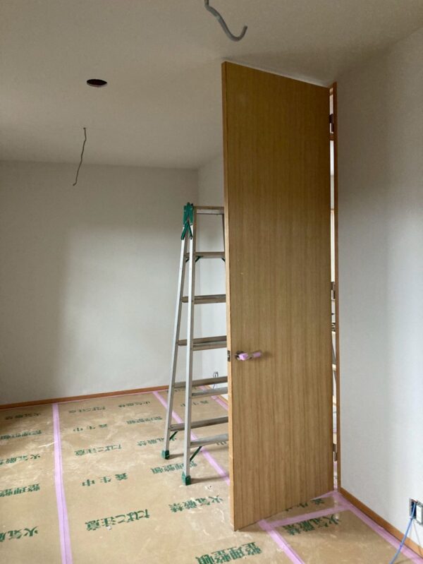 子ども部屋の壁紙もきれいに完成。ドアは当社標準仕様のタモ材を使った造作建具で、木目がやさしく、洋室にも和室にもなじみます。なお、写真のドアは高さ2400ミリの特注ハイドアです。