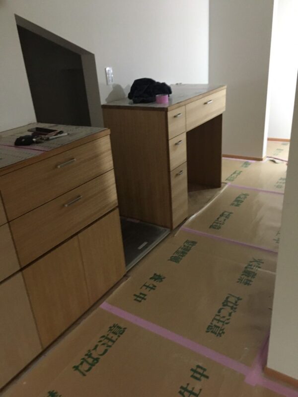 建具と同じタモ材で製作した収納家具が現場に届きました。これはキッチン背面に設置するカップボードです。さっそく取り付けていきます!