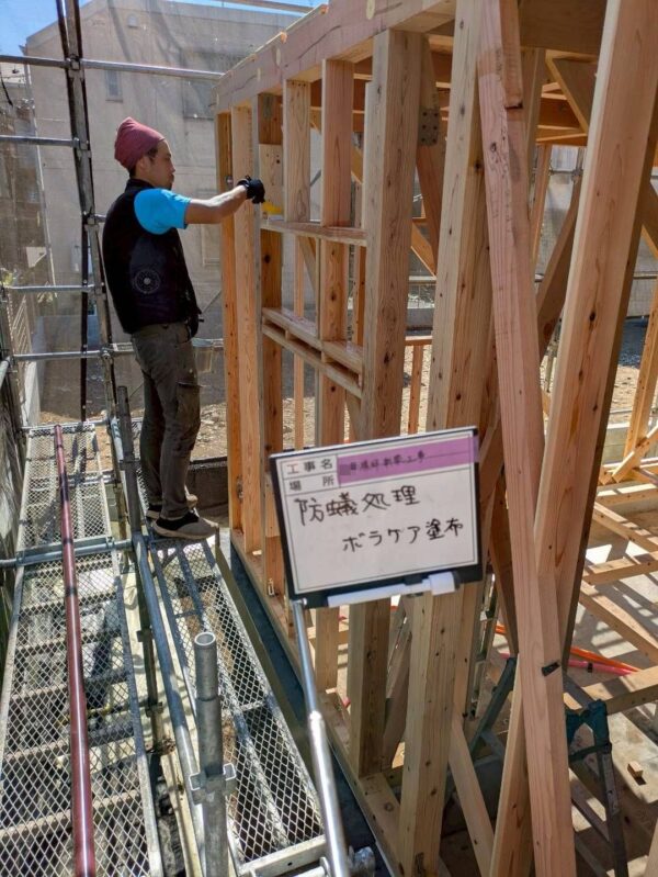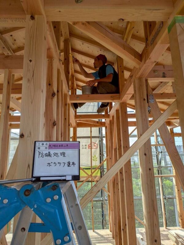 それは、家の構造体全体に防蟻剤を塗ることです。小野寺工務店の標準仕様では、地面から1.5メートルの高さまでボラケアという防蟻剤を塗るのですが、T様邸ではご希望により、構造躯体全体に塗布します。理由は、アメリカカンザイシロアリ対策。