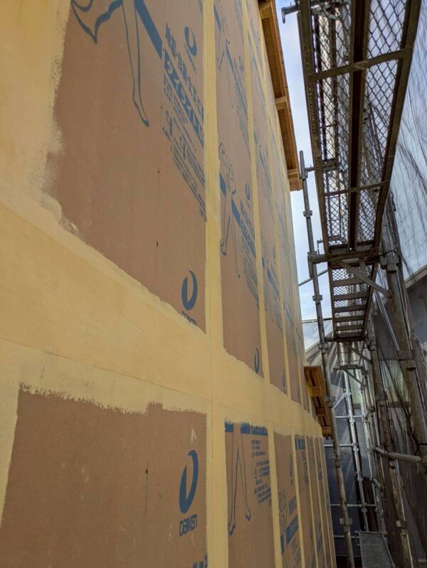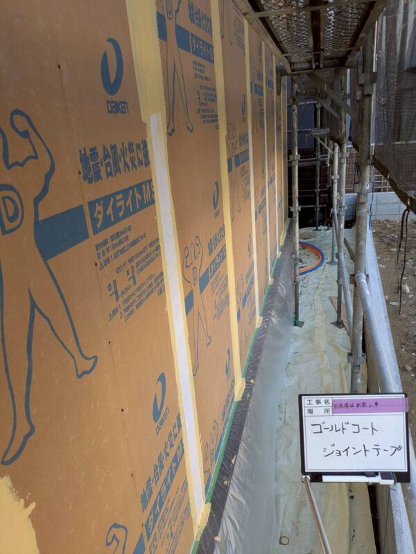 耐力面材の継ぎ目をジョイントテープとゴールドコートで完全に塞ぎました。