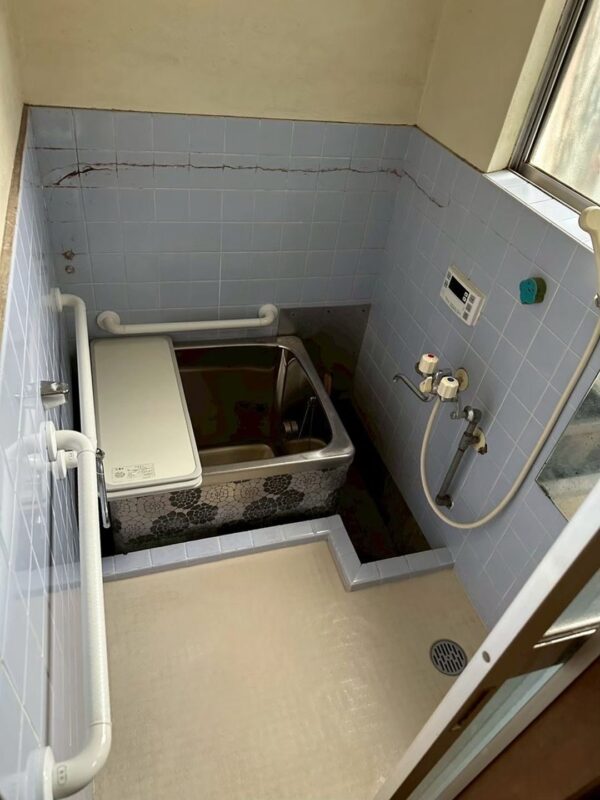 下の写真はリフォーム前の浴室です。浴槽の横にある大きな隙間 は、以前設置されていたバランス釜の給湯器の名残りです。浴槽まわりに隙間が多く、お掃除も大変だったため、今回は最新のユニットバスに交換します。