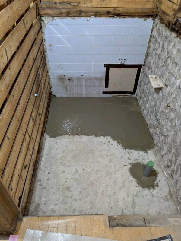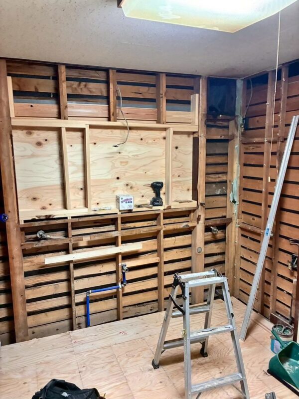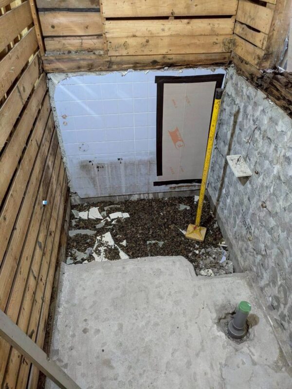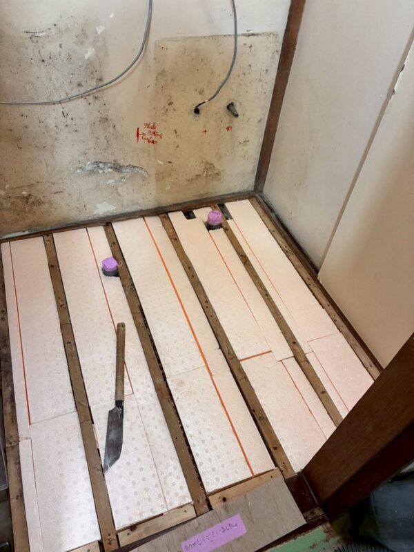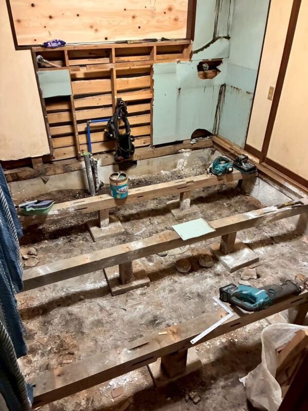浴槽を取り外し、壁の表面を剥がしたところです。このあと、床面にコンクリートを流し込んで平らにしていきます。