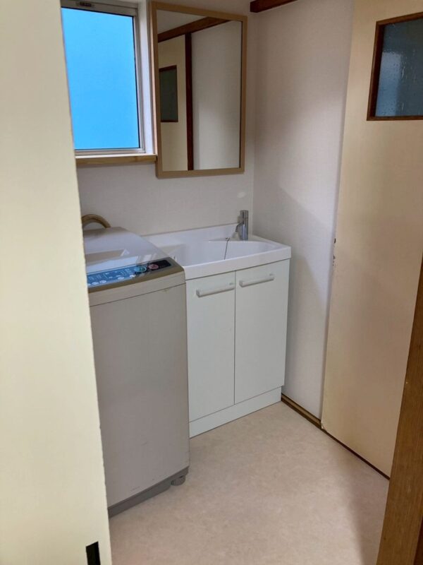 続いてこちらはリフォーム前の洗面室。洗面台の収納付きミラーのデザインが昭和レトロで、なかなか味わい深いですね。