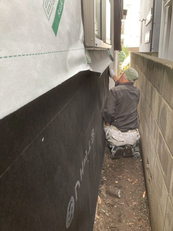 リフォーム後の写真を撮り忘れたので、工事中の写真を貼っておきます。洗面室の窓は窓枠を交換、浴室の窓は窓ごと交換し、さらに外壁もかなり傷んでいたので、外壁のリフォームも行いました。下の写真は職人さんが外壁用の防水シートを貼っているところです。