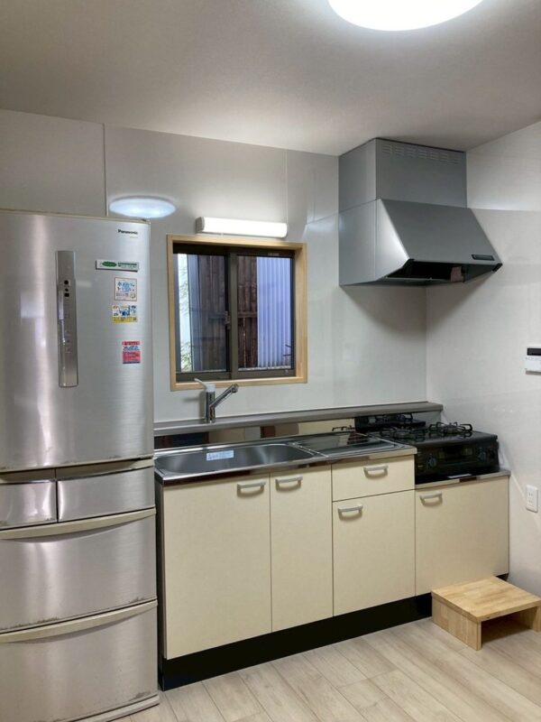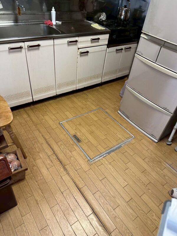 続いてキッチンです。ここは床が傷んでいて、全体的に斜めに傾いている状態でした。また、「キッチンをコンパクトにして、冷蔵庫をすっきり収めたい」というご要望もいただいていました。