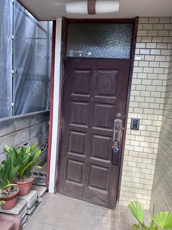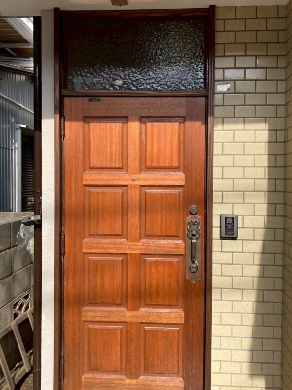 再塗装を施した玄関ドアがこちらです。今ではなかなか手に入らない、しっかりした木製玄関ドアがステキに蘇りました!