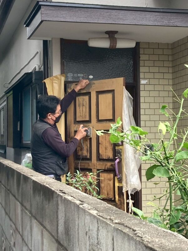 最後に、玄関ドアのリフォームの様子を紹介します。N様邸の玄関ドアは、木製でしっかりとした重厚感のあるタイプ。こうしたタイプのドアは、少し手間をかけて修繕を行うだけで、驚くほどステキな玄関ドアに生まれ変わります(今となってはなかなか手に入らないですし、交換するのはもったいないです)。