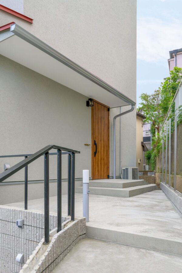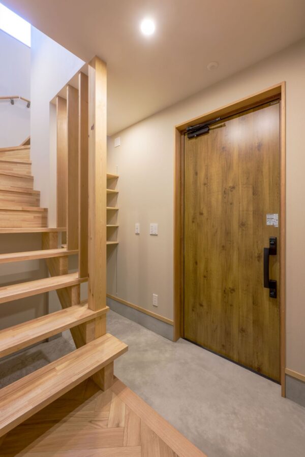 まずはエントランスから。O様邸は、前面道路からエントランスへと上がる土間階段もなかなかの力作なのですが、撮影時はまだ工事中で、残念ながら写真が撮れませんでした。うーん、残念!