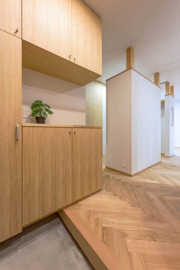 玄関から室内を見た様子です。玄関収納は、当社定番の柾目(まさめ)のタモ材でつくった造作収納。また、O様邸の1階の壁は上部を開けたつくりにしています。こうすることで視線が遠くまで通り、空間全体がより開放的に感じられるようになっています。