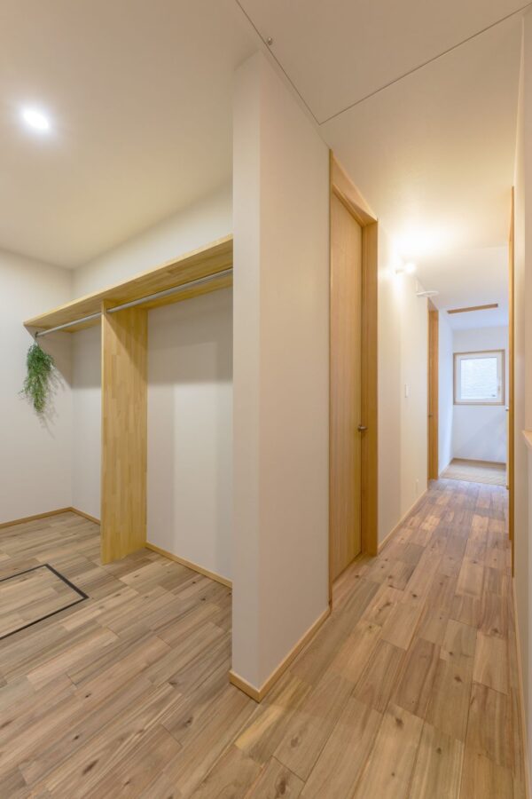 ここからは2階の写真になります。下の写真は、階段を上がってすぐのところにある第2のファミリークローゼット。2階の建具は、すべて天井までの高さでそろえた造作のハイドアになっています。