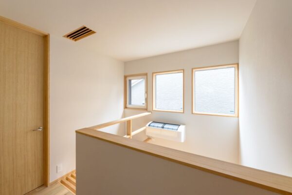 2階吹き抜けの写真です。写真左上の木製ルーバーは、小屋裏エアコンの吹き出し口です。夏場はここから冷たい空気がゆっくりと下りてきて、家全体を心地よく冷やしてくれます。