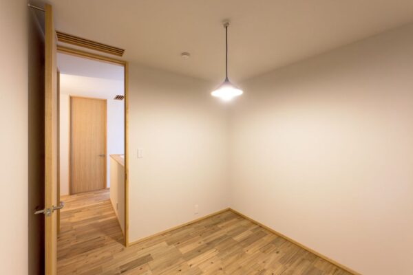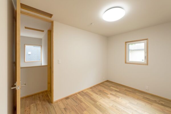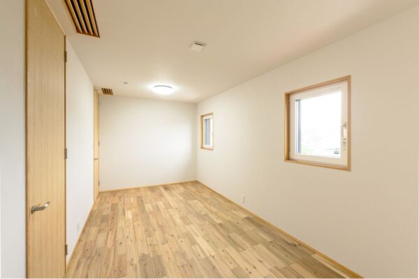 こちらは子ども部屋です。将来2部屋に仕切れるよう、あらかじめドアと窓を2つずつ配置しています。また、この部屋にも小屋裏エアコンの吹き出し口を設けています。