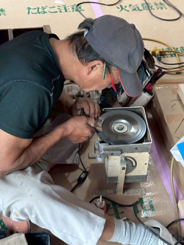 近づいて撮った写真がこちら。実は、刃物研磨機で鉋(カンナ)の刃を研いでいるところでした。最近は替え刃式の鉋を使う大工さんも多いのですが、鈴川大工は昔ながらの鉋を愛用しています。定期的に研ぐ手間はありますが、そのぶん切れ味は抜群です。