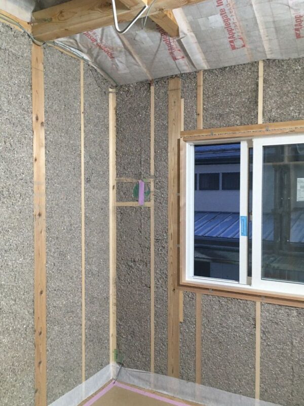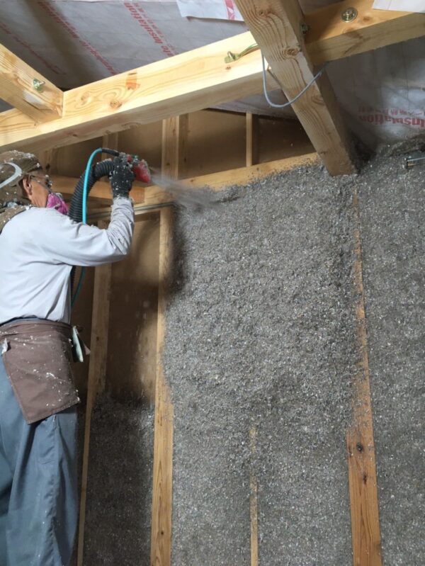 下の写真は、断熱材のセルロースファイバーを壁の中に吹き付けているところです。このセルロースファイバーには、トウモロコシ由来の天然の糊成分がほんの少し混ぜてあり、霧状の水といっしょに吹き付けることで壁の内側にしっかり固着します(ウォールスプレー工法といいます)。