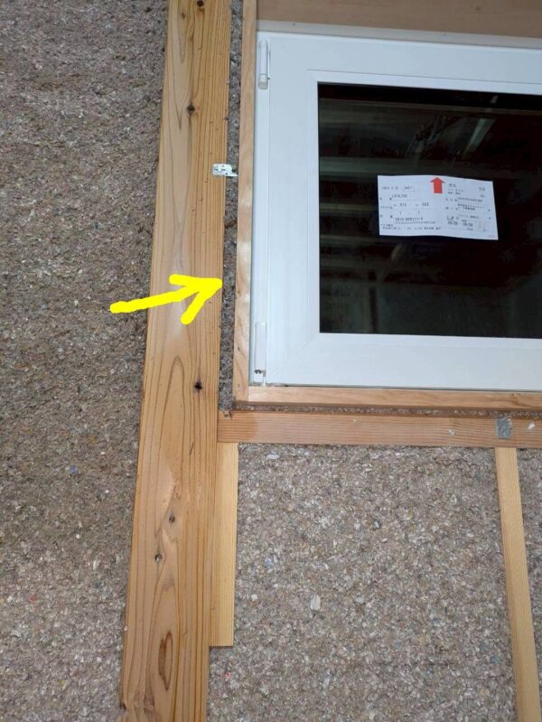 矢印のような、ほんのわずかな隙間にも丁寧にセルロースファイバーを充填していきます。断熱工事は、使う断熱材の種類も大切ですが、それと同じくらい施工の精度が重要です。