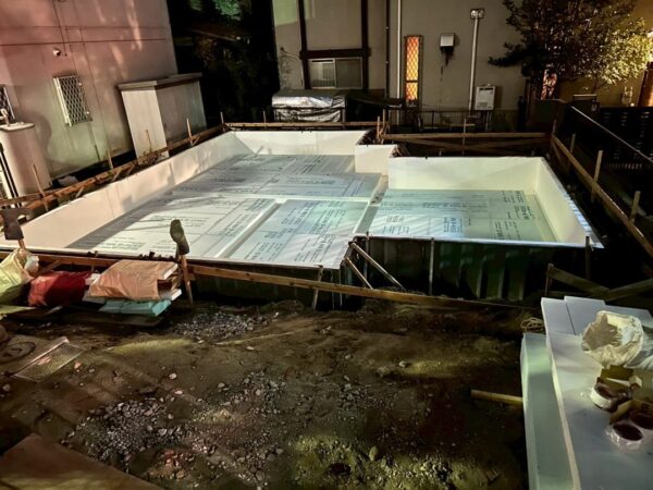 底面へのコンクリート打設が完了しました。この状態で、コンクリートがしっかり固まるまで数日間養生します。