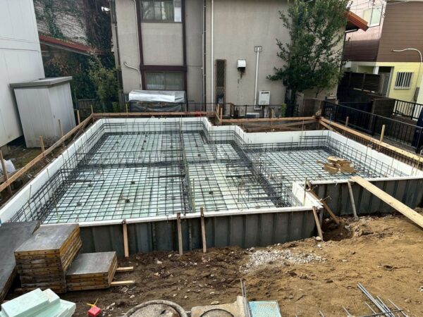 断熱材で囲った中に配筋を組みました。一部、配筋が密になっているところがありますが、そこが地中梁です。