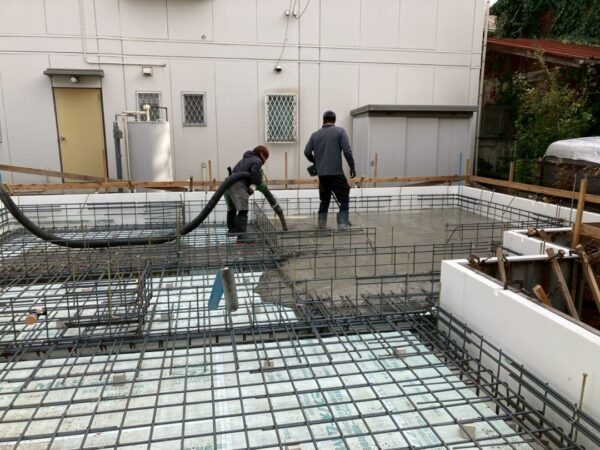 コンクリートの打設が始まりました。コンクリートを流し込む人、撹拌棒(バイブレーター)で気泡を抜く人、二人一組で作業を進めていきます。
