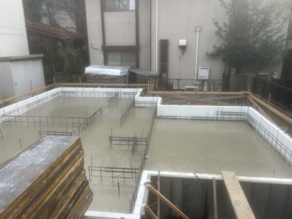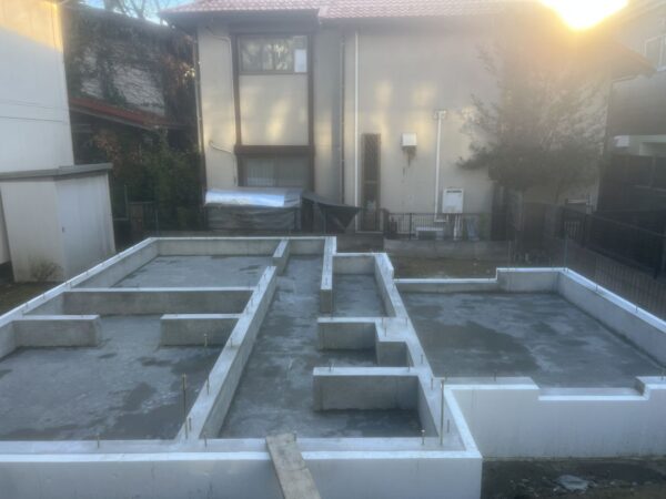 そして、こちらができたての基礎です。周囲の白い部分が断熱材になります。