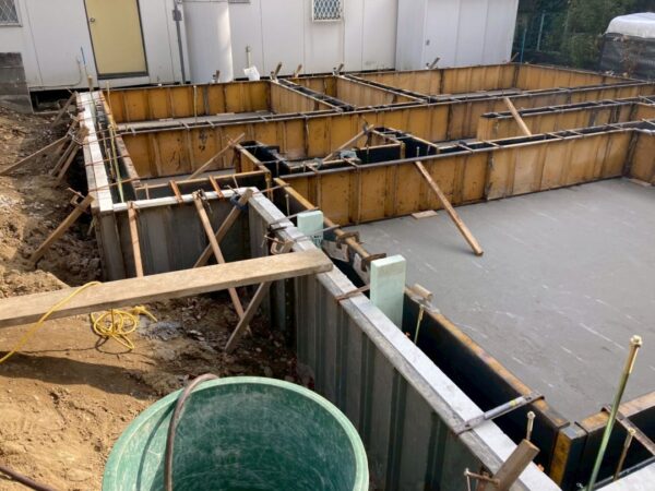 底面のコンクリートが固まったのを確認してから、立ち上がり部分の型枠を組んでいきます。このあと、型枠の中にコンクリートを打設します。