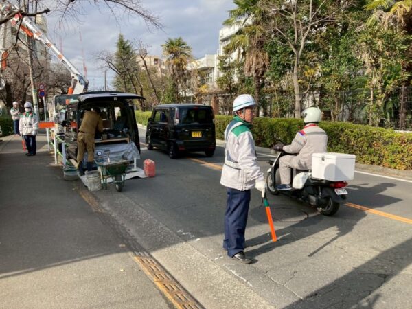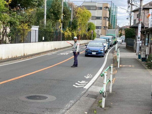さて、基礎工事そのものは当社の標準仕様で、特別難しい工程はなかったのですが、実はK様邸では、現場前の交通整理がものすごく大変でした。下の写真が敷地前面の道路です。駅に近い片側一車線のバス通りで交通量が多く、当日は交通整理のスタッフが5人必要になりました。