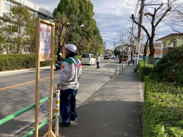 さらに、生コン車を停める位置にバス停があったため、事前に京王バスさんと協議を行い、臨時のバス停を設置しました。近隣のみなさまには、当日たいへんご迷惑をお掛けしたことと思います。上棟時など、今後も一時的にご不便をお掛けすることがあるかと思いますが、なにとぞご理解、ご協力のほど、よろしくお願いいたします。