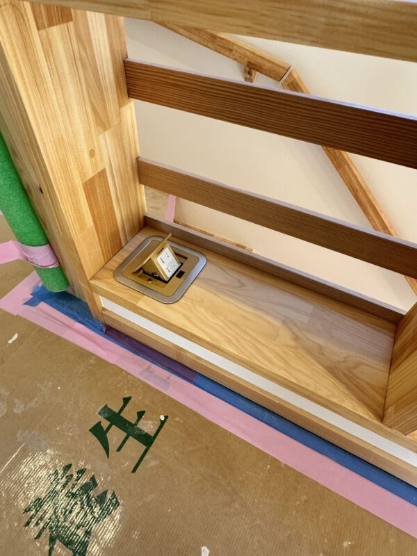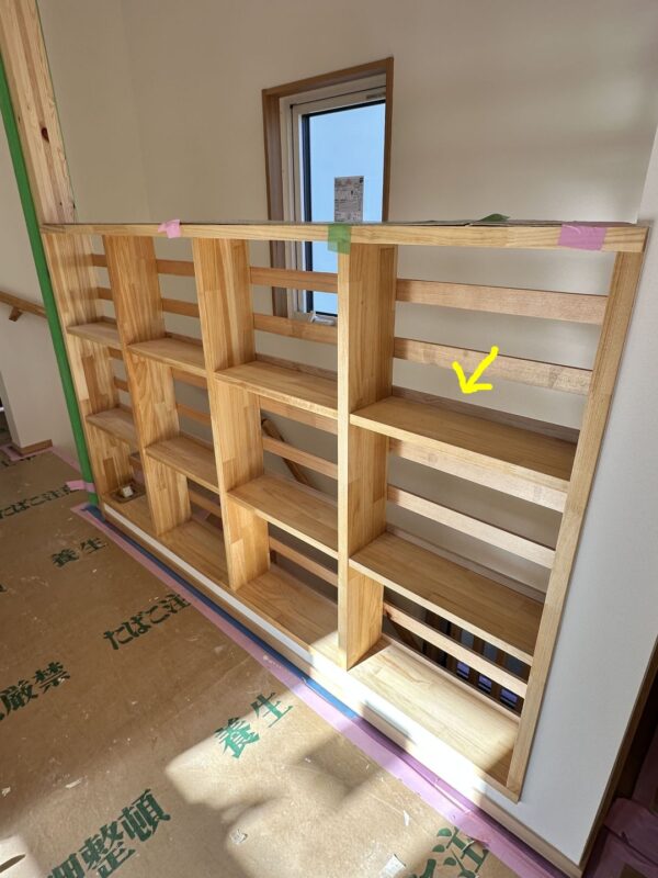 実は、棚板の階段側に背板を追加しています(黄色い矢印の先です)。T様とお話ししている中で、「小さな置き物を置くかもしれない…」という話になり、「それなら落下防止用の背板を付けておきましょう」ということになったのです。