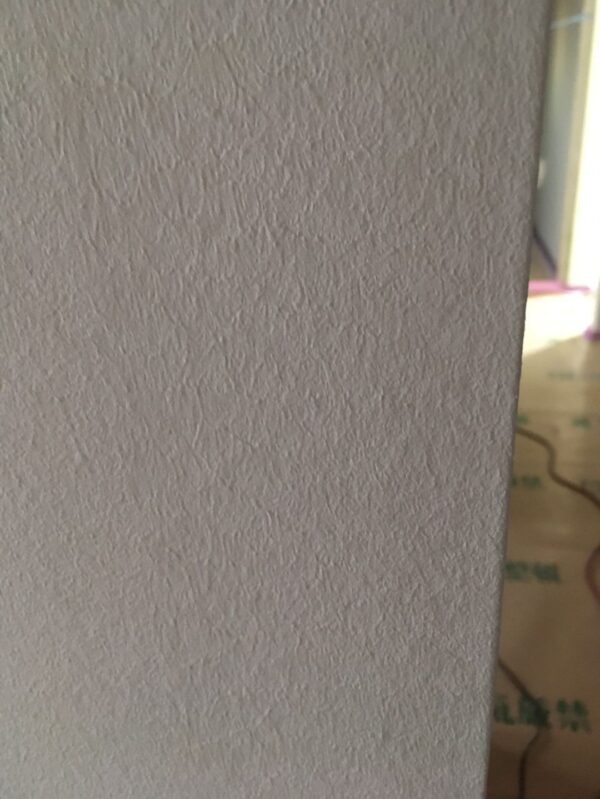 話は変わって、下の写真は、T様邸の内壁に貼った「KOBAU(コバウ)」というドイツ製の紙クロスです。ザラッとした手触りで、なかなか味わいのある雰囲気の紙クロスですが、実はまだ内装仕上げの途中段階です。
