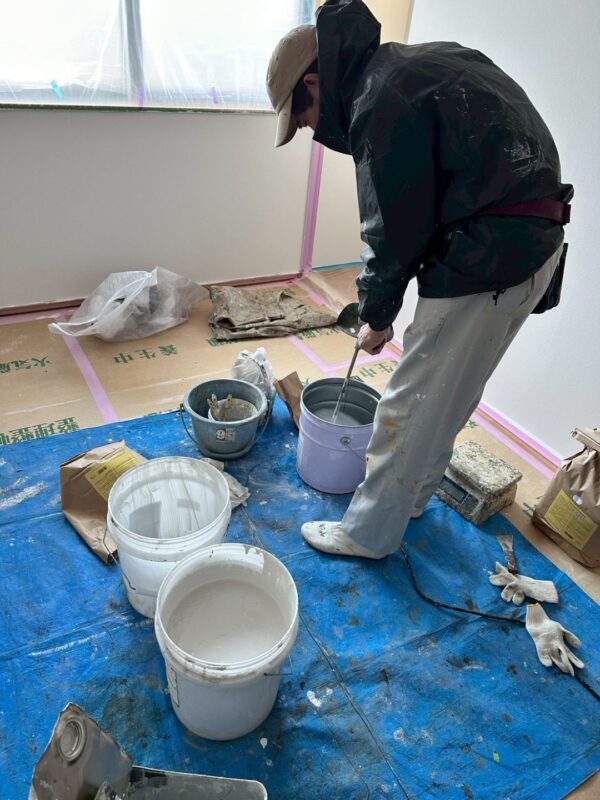 このあと、この上から「プラネットウォール」というヨーロッパ漆喰を塗っていきます。プラネットウォールは、天然の消石灰、白亜、大理石、珪石などを主成分とした100%天然由来の塗り壁材です。